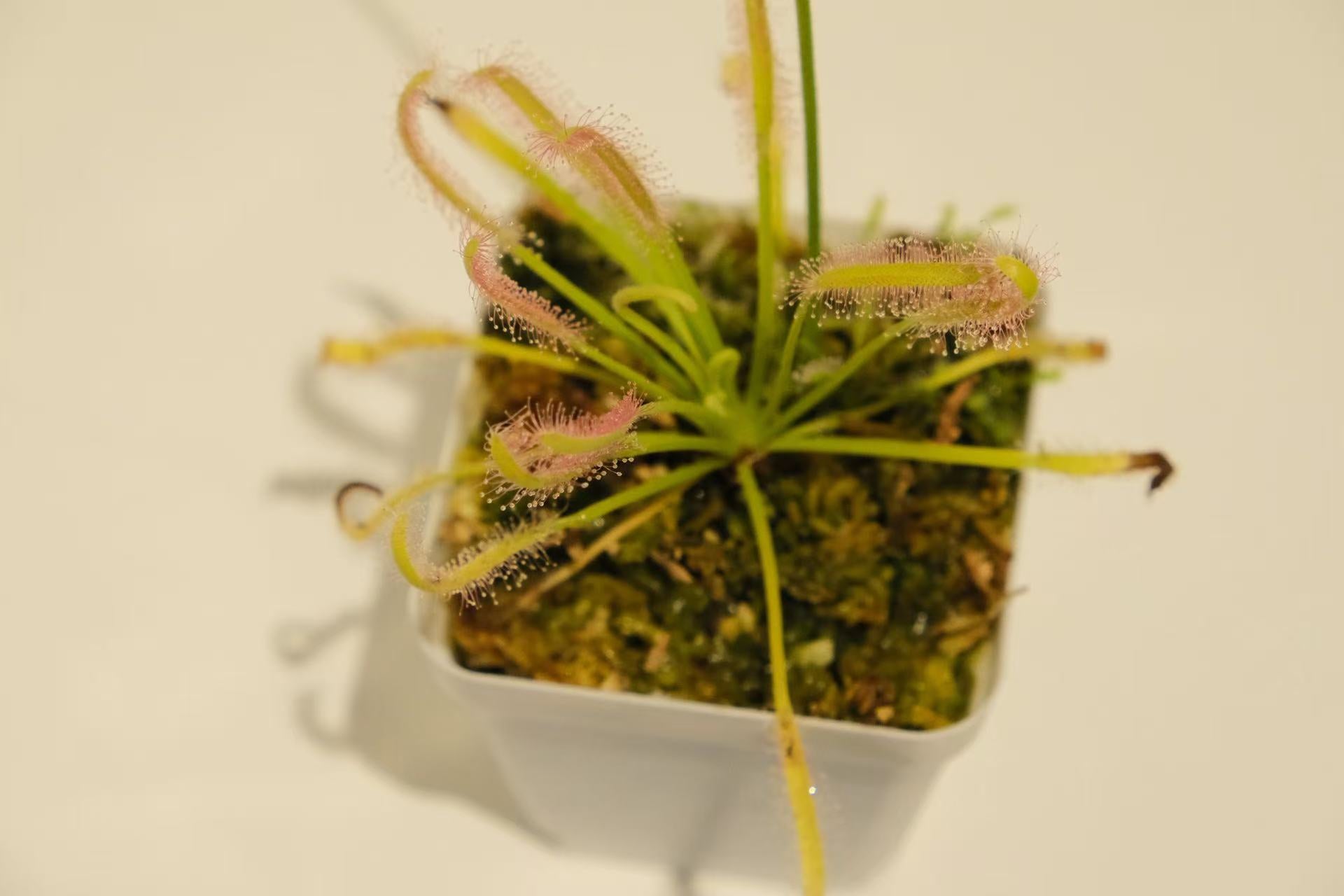 The Cape Sundew is one of the most popular and beginner-friendly carnivorous plants, native to South Africa. It forms a striking rosette of long, narrow leaves covered with glistening, red-tipped tentacles that secrete a sticky mucilage. This "dew" traps insects, which are then digested by the plant to supplement nutrients from poor soil.